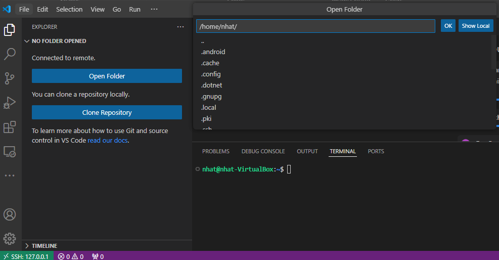• You’ll be prompted to select a folder on your Ubuntu virtual machine to open.